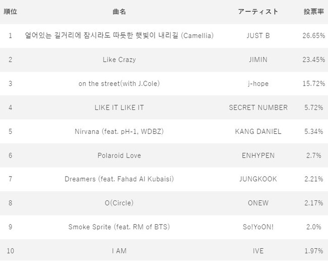 『IDOL CHAMP presents POP-K TOP10 Friday』4月28日(金)の放送回において、JUST Bの「얼어있는 길거리에 잠시라도 따듯한 햇빛이 내리길(Camellia)」が、チャート投票で1位を獲得し、今週のNo.1曲として番組内で放送されました。