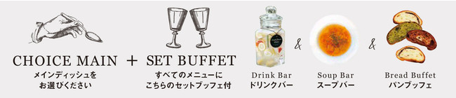 パン食べ放題・ドリンク飲み放題・スープ飲み放題で人気のブッフェは変わらずセットで付いてきます!