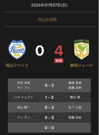 2024-01-07 一般社団法人Tリーグ ノジマTリーグ 2023-2024シーズン 公式戦 1月7日開催 岡山リベッツ vs 静岡ジェード 試合結果 Tweet ノジマTリーグ 2023-2024シーズン 公式戦 1月7日開催 「岡山リベッツ vs 静岡ジェード」の試合結果を発表いたします。 岡山リベッツと静岡ジェードの試合は0-4で静岡ジェードが勝利しました。 企業プレスリリース詳細へ PR TIMESトップへ 公式ツイッター Follow @Straightpress 最新情報をTwitterで受け取ろう! 公式フェイスブックページ 最新情報をFacebookで受け取ろう! 前の記事 一覧へ戻る 次の記事