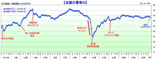 株式会社帝国データバンクは、調査対象(2万3,349社、有効回答企業1万312社、回答率44.2%)を対象とした2026年3月の国内景気動向を調査・集計し、景気DIとして発表いたしました。