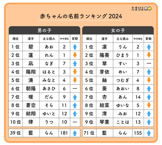 ●赤ちゃんの名前ランキング2024:男の子は「碧」が2年ぶりに1位復活、女の子は「凛」が15年ぶりに1位に返り咲き