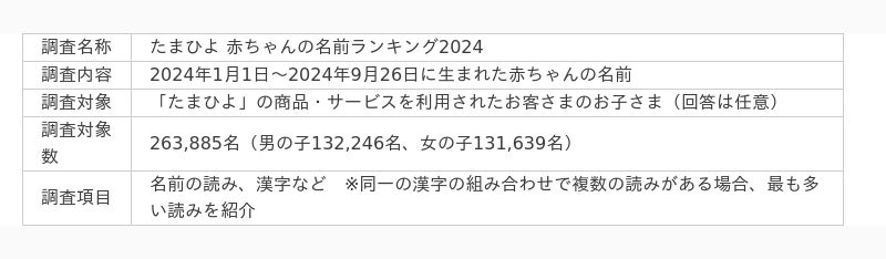 株式会社ベネッセコーポレーション(本社:岡山県岡山市、代表取締役社長:小林 仁)の妊娠・出産・育児ブランド「たまひよ」では、2005年から「たまひよ 赤ちゃんの名前ランキング」を発表しています。今年も2024年1月1日~2024年9月26日に生まれたお子さま約26万人のお名前を調査・集計したランキングを発表いたします。名前ランキングとしての集計数は国内最多となります。(※2024年10月自社調べ)
