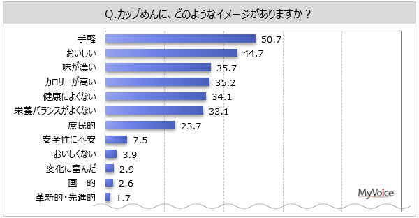 ■カップめんのイメージは「手軽」が5割強、「おいしい」が約45%、「味が濃い」「カロリーが高い」「健康によくない」「栄養バランスがよくない」が各30%台。「栄養バランスがよくない」は、女性や若年層で比率高い