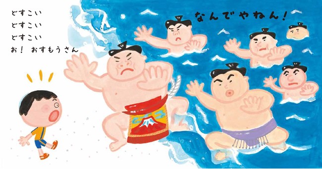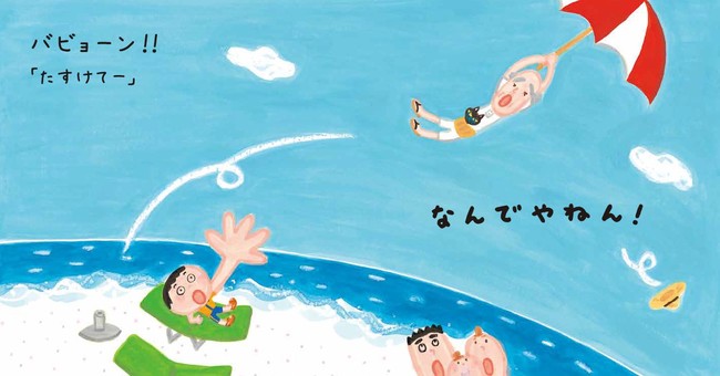 大勢のおすもうさんがやってきたり、おじいちゃんがパラソルと一緒に飛んで行ってしまったり、有名な昔話のキャラクターも登場したり、こんな海水浴、ありえない! という出来事が次々に起こります。まさに「なんでやねん!」