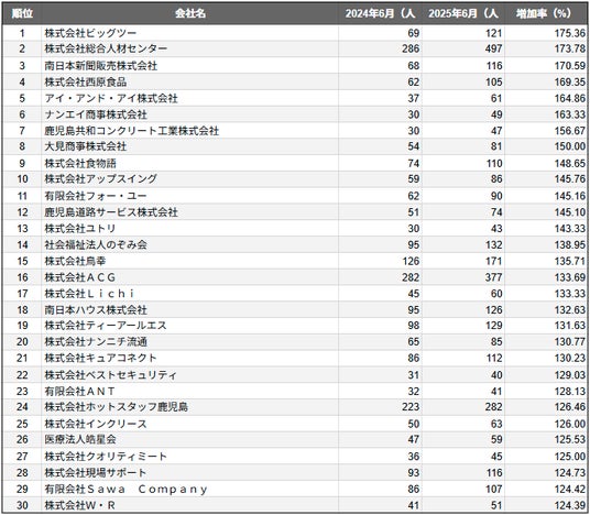 株式会社SalesNow(本社:東京都渋谷区、代表取締役:村岡功規、以下「当社」)は、国内540万社の企業情報を完全網羅した日本最大級のデータベース「SalesNow DB」より、人口の多い上位30都市を対象とした「従業員数増加率ランキング」を発表しました。本リリースでは、各都市別のデータをもとに、今回は「鹿児島市に本社を置く企業」を対象に、従業員数の増加傾向にフォーカスします。