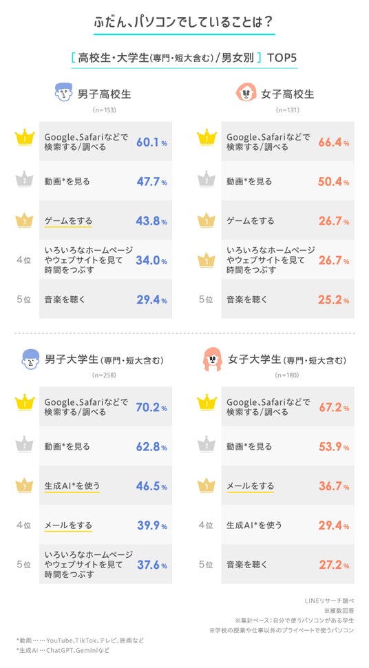 高校生・大学生ともに「検索」がトップ。次いで「動画を見る」。男子大学生は「生成AIを使う」が高め。