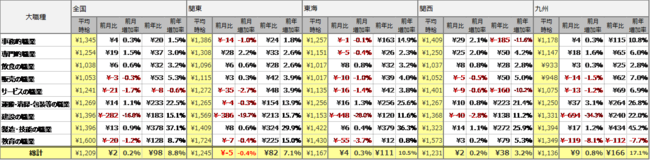 全国の平均時給について、事務的職業は1,345円(前月比4円増、前年比20円増)、専門的職業は1,254円(前月比19円増、前年比37円増)、飲食の職業は1,038円(前月比6円増、前年比32円増)、販売の職業は1,053円(前月比3円減、前年比53円増)、サービスの職業は1,241円(前月比21円減、前年比8円減)、運搬・清掃・包装等の職業は1,269円(前月比14円増、前年比233円増)、建設の職業は1,396円(前月比282円減、前年比183円増)、製造・技能の職業は1,396円(前月比13円増、前年比378円増)、教育の職業は1,600円(前月比20円減、前年比128円増)となり、9職種中8職種が前年を上回りました。