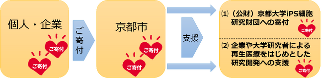 京都市では、「治らない病気を 1つでも減らしたい」という想いで、iPS財団への寄付、そしてiPS細胞技術をはじめとする再生医療等の研究開発への支援を目的に、令和2年度から本プロジェクトを立ち上げました。