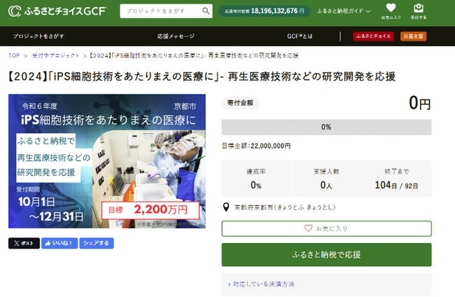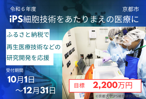 京都府京都市(市長:松井孝治、以下「京都市」)と国内最大級のふるさと納税総合サイト「ふるさとチョイス」( https://www.furusato-tax.jp/ )を企画・運営する、株式会社トラストバンク(本社:東京都品川区、代表取締役:川村憲一、以下「トラストバンク」)は、本日10月1日トラストバンクが提供する、ふるさと納税制度を通じてクラウドファンディング型で寄付を募る仕組み「ガバメントクラウドファンディング(R)」(以下「GCF(R)」)で、iPS細胞に関する技術を企業や研究者へ橋渡しする取り組みを行う(公財)京都大学iPS細胞研究財団(以下、「iPS財団」)の支援や、再生医療をはじめとしたライフサイエンス分野における研究開発を支援することを目的としたプロジェクトを開始します。募集期間は2024年10月1日~12月31日で、目標寄付金額は2,200万円です。