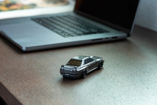 本体は、GT-R (BNR32)のシルエットを忠実に再現した車型マウスです。ガンメタリックのボディカラーと細部まで作り込まれた造形により、まるでミニカーのような存在感を放ちます。サイドのラインやリアウィングのフォルムなど、GT-R (BNR32)ならではのデザインをしっかりと表現。フロントライトとリアライトは電源ON時に点灯し、デスクに置くだけでインテリアとしても絵になる仕上がりです。