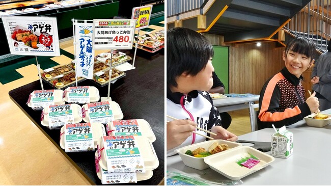 青森県内の大型スーパー・マエダストアさんとの共同開発で誕生した「海のアゲ弁」。ひじきご飯に海苔を敷いて、主役のアゲ魚っ子ボールに、タコのから揚げ、タコさんウインナーに卵焼き、ゆで野菜と、彩りもキレイなお弁当です。キャンペーン皮切りの3日間は、県内36店舗で一斉販売し、その後は大間店で継続して販売。さらに、町内2つの小学校に昼食として無償提供し、食べて学べる、海の食育の機会を設けました。海のアゲ弁は、店舗での販売と学校での提供をあわせてのべ1,600人に食べてもらい、大間の海のメッセージを届けることができました。これからも、”子どもたちが大好きなおかず”として、アゲ魚っ子の定着を目指します。