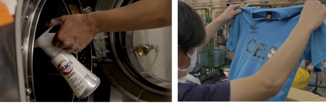 (2)集まったユニフォームを、クリーニング専門業者にてていねいに洗たくし(アタックZEROを使用)、検品。