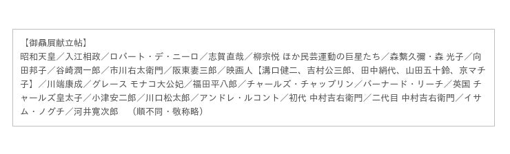 昭和天皇/入江相政/ロバート・デ・ニーロ/志賀直哉/柳宗悦ほか民藝運動の巨星たち/森繫久彌と森光子/向田邦子/川端康成/グレース モナコ大公妃 ほか
