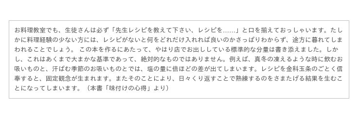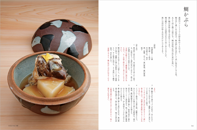 道具の使い方から、焚きもの、味付けの心得、焼きもの、揚げもの、蒸しもの、鉢もの、汁ものまで。料理の基本、ご主人が料理に向き合う際に心掛けていることを余すことなくご紹介。名店の味をご自宅で再現できるよう、レシピも掲載しています。