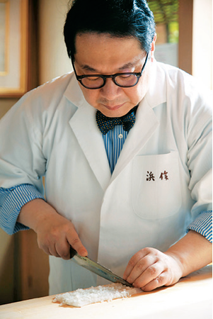 京都を代表する名店「浜作」のご主人。「浜作」は日本最初の割烹料理店で、現当主は三代目にあたる。美術や歌舞伎、音楽など芸術をこよなく愛し、供される料理の器には、さりげなく河井寛次郎などの知られざる名品が用いられている。「古都の味 日本の味 浜作」と川端康成を嘆息させた名店の味を守り、一期一会の精神で日々板場に立っている。
