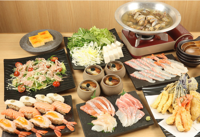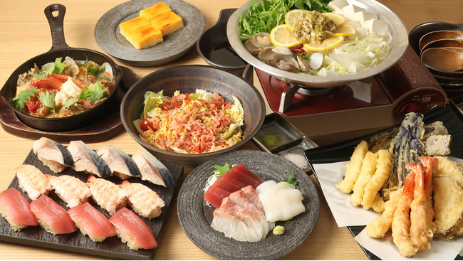 ・天麩羅盛り合わせ ・鮪つくねのネギ塩レモン鍋 ・寿司3種 ・ひとくちカタラーナ