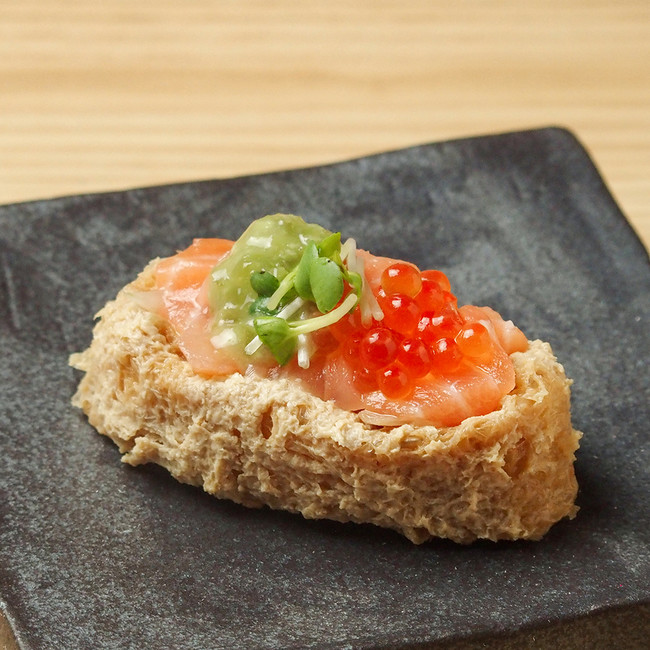 ■炙り海老 雲丹ソース(一貫) ■飲める親子稲荷(一貫) ■飲めるサーモン(二貫)
