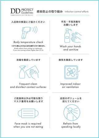 株式会社ダイヤモンドダイニングが運営する各店舗では、お客様に安心してお食事を楽しんでいただくため、行政が定める方針に基づいた感染防止対策を最大限に講じ「DD PROTECT Guidelines」として実施しております。