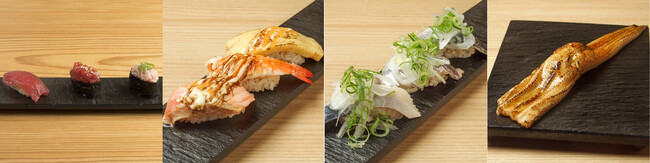 他にも、寿司ネタの定番から、同じネタでも違うネタでもお好みで選べる【王道三貫】や【厳選二貫】、【特選一貫】の中には、お客様の目の前で、バーナーで炙って仕上げる「穴子一本」など、味も見た目も楽しめる一皿をご用意しています。