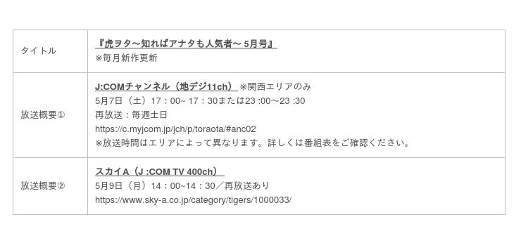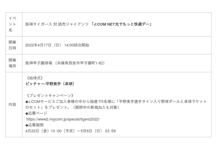 始球式の模様は、J:COMのコミュニティチャンネル「J:COMチャンネル」(地デジ11ch)と「スカイA」(J :COM TV 400ch)で放送中の、阪神タイガースを記録(データ)から読み解く新感覚の野球情報番組『虎ヲタ 5月号』において放送予定。始球式本番はもちろん、投球に向かう平野選手の姿をお届けします。