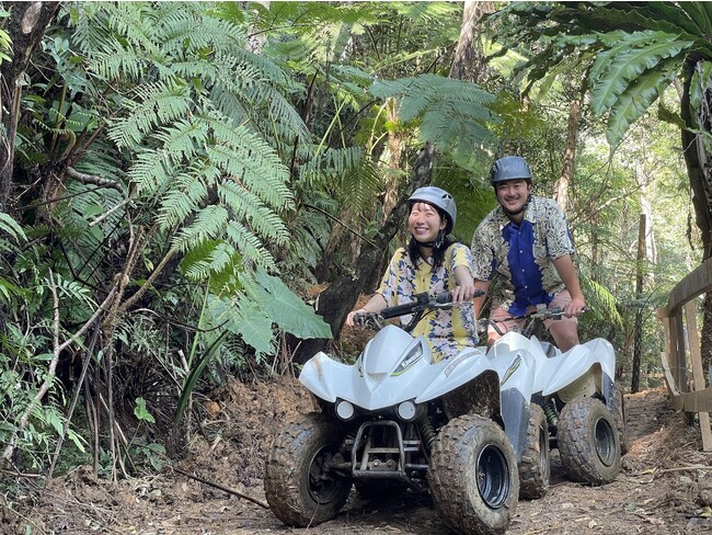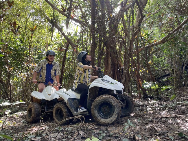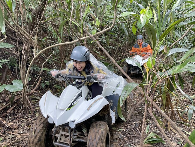 「どろんこバギーアドベンチャー」では、ホテルと沖縄美ら海水族館の中間地点にある名護市中山に今年新設されたコースを走行します。整備された道ばかりではなく、でこぼこ道や木々の隙間を縫ってやんばるの森を進み、沖縄に自生する珍しい植物や偶然通りがかる動物などについて、ツアーガイドの解説を聞きながらアドベンチャー体験が味わえます。晴れの日はもちろん、雨の日は水しぶきや泥跳ねといった非日常的な自然とのふれあいも体験でき、大地の起伏をダイレクトに実感できるスリリングでエキサイティングな走りが楽しめます。