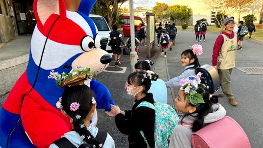 「おおきなわ」の活動の一環として実施している「ゴーディーによる朝のあいさつ運動」において、2月はホームタウン沖縄市、うるま市、国頭村の小中学校を訪問し、あいさつ運動に参加いたしました。ご協力いただいた各学校の皆さま、ありがとうございました。