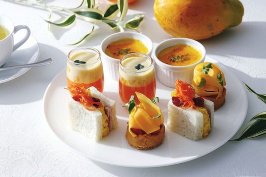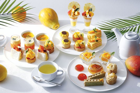 この夏にご提供する「Vegan Afternoon Tea -Summer-」では、トロピカルフルーツを主役に南国の楽園で楽しむ”Garden Party(ガーデンパーティ)”をイメージしたスイーツ8種・セイボリー4種をご用意しました。スイーツでは夏のきらめく太陽を思わせるパインアップルが印象的なミニパフェや、ひまわりの形に絞られたヴィーガンバターのクリームがキュートなマフィン。また、パティシエ自らヴィーガンバターや小麦粉などの原料をバランスよく配合させしっとりと焼き上げた自慢のスコーンなど、素材の選定から製法までこだわり抜いた8品が並びます。セイボリーは、ヴィーガンミートを使用したグラタンやパパイヤをまとったフムスなど、イエローやオレンジなどのビタミンカラーがまぶしい華やかなヴィーガンメニューをご堪能いただけます。