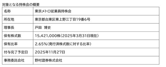 東京メトロ及びグループ会社は、特別奨励金として付与条件を満たすすべての持株会会員に対し、1人あたり100,000円を付与し、持株会を通じて東京メトロ株式を市場から取得し、会員に配分いたします。(2025年11月27日付与完了予定)