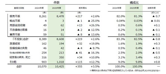 主因別にみると、「販売不振」が8478件(前年度8261件、2.6%増)で最も多く、2年連続で8000件を上回った。「売掛金回収難」(前年度49件→62件、26.5%増)や「業界不振」(同59件→51件、13.6%減)などを含めた『不況型倒産』の合計は8608件(同8389件、2.6%増)と、4年連続で前年度を上回り、全体の82.5%(対前年度0.8ポイント減)を占めた。