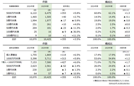 資本金を規模別にみると、『個人+1000万円未満』の倒産が7580件(前年度7153件、6.0%増)発生し、全体の72.7%を占めた。件数、構成比ともに2000年度以降で最多となった。