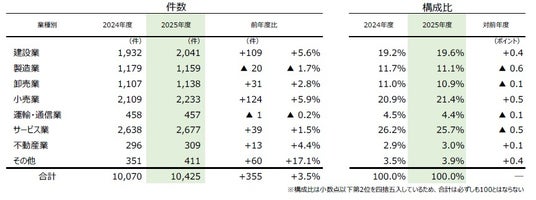 業種別にみると、7業種中5業種で前年度を上回った。『サービス業』(前年度2638件→2677件、1.5%増)が最も多く、『小売業』(同2109件→2233件、5.9%増)が続いた。『サービス業』と『小売業』は、ともに2000年度以降で最多を更新した。『建設業』(同1932件→2041件、5.6%増)と『不動産業』(同296件→309件、4.4%増)は過去10年で最多となった。『運輸・通信業』(同458件→457件、0.2%減)は前年度から微減となったものの、3年連続で400件を上回った。