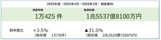 株式会社帝国データバンクは、2025年度の企業倒産件数(負債1000万円以上の法的整理が対象)について集計し、分析を行った。