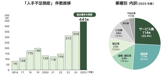 「人手不足倒産」は、441件(前年度350件、26.0%増)判明した。年度としては、初めて400件を超え、過去最多を大幅に更新した。業種別では、『サービス業』(114件)が最も多く、『建設業』(112件)、『運輸・通信業』(69件)が続いた。「従業員10人未満」の小規模企業が333件と、全体の約75%を占めた。
