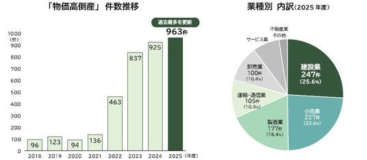 「物価高倒産」は、963件(前年度925件、4.1%増)判明した。2年連続で900件を超え、過去最多を更新した。業種別では、『建設業』(247件)が最も多く、『小売業』(227件)、『製造業』(177件)が続いた。負債額別にみると、「1億円以上5億円未満」が368件で最も多く、「5000万円未満」が318件で続いた。