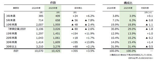 業歴別にみると、「30年以上」が3278件(前年度3210件、2.1%増)で最も多く、全体の31.4%を占めた。2年連続で3000件を上回り、過去10年で最多となった。このうち、老舗企業(業歴100年以上)の倒産は147件(同152件、3.3%減)となった。