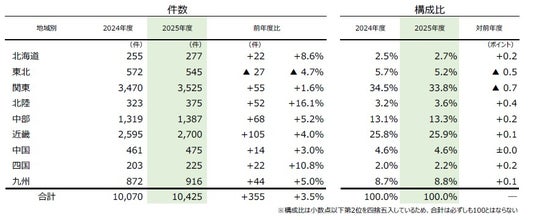 ■地域別にみると、唯一前年度を下回った『東北』(前年度572件→545件、4.7%減)を除く8地域が過去10年で最多となった。『関東』(同3470件→3525件、1.6%増)は、4年連続で前年度を上回り、全体の33.8%を占めた。増減率でみると、『北陸』(同323件→375件、16.1%増)が最も高く、全県で前年度を上回った