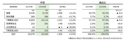 『清算型』では、「破産」が9725件(前年度9435件、3.1%増)で最も多く、4年連続で前年度を上回り、全体の93.3%を占めた。「特別清算」は、390件(同369件、5.7%増)で、2000年度以降で最多を更新した。