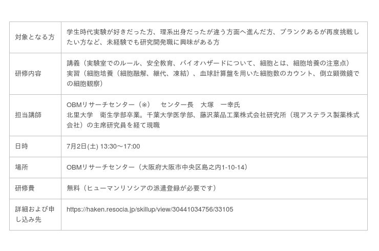 そこで当社は、ヒューマングループの教育連携校である学校法人佐藤学園OBMリサーチセンターと共同で、バイオリサーチ分野の研究者による講義と細胞培養が体験できる無料研修を、7月2日(土)に大阪で開催します。バイオ分野へのキャリアチェンジのきっかけとして、研究開発職の仕事を体験いただくことで、バイオ分野での新たな就業機会の創出にも取り組んでまいります。