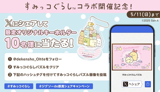 「すみっコぐらし」コラボパズルをクリアして、完成したパズル画像と指定のハッシュタグをつけてXに投稿した方の中から抽選でコラボ限定「すみっコぐらし」オリジナルグッズをプレゼント!