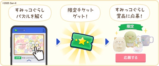 「ジグソーde懸賞」アプリ内でコラボパズルをクリアすると、限定チケットを獲得。集めたチケットで「すみっコぐらし」グッズが当たる懸賞に応募できます。