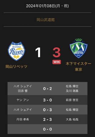 ノジマTリーグ 2023-2024シーズン 公式戦 1月8日開催「 岡山リベッツvs木下マイスター東京」の試合結果を発表いたします。