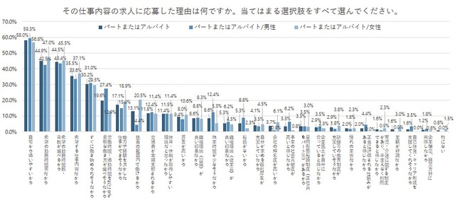 一方、「女性」のほうが「男性」よりも「自宅から通いやすいから」が19.6pt、「交通費が全額支給されるから」が6.1pt高くなった。通いやすさは女性の半数以上が選択しており、費用を含めた通勤に関する事柄を意識している人が多いようだ。