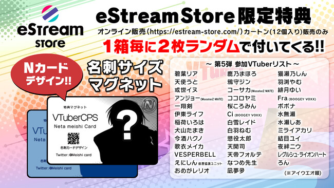 株式会社CyberZ(本社:東京都渋谷区、代表取締役社長:山内隆裕)の連結子会社、株式会社eStream(本社:東京都渋谷区、代表取締役社長:高井里菜)は、人気バーチャルYouTuber(以下、VTuber)全38組114種類のオリジナルカードが付いた「VTuberチップス5」を2023年7月25日(火)より発売することを決定いたしました。全国のファミリーマート店舗、ヴィレッジヴァンガード、アニメイトの各店舗、当社のECサイトeStream Storeで販売する他、アミューズメント施設では限定BOX仕様でGIGO、タイトー、ナムコの店舗・オンラインクレーンにて順次展開いたします。