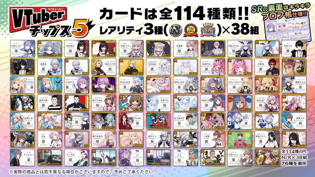 人気VTuber全38組がカード化された本商品には、ネタ(N)カード38種、レア(R)カード38種、スーパーレア(SR)カード38種の全114種類のうち、ランダムでカードが1枚付いてきます。