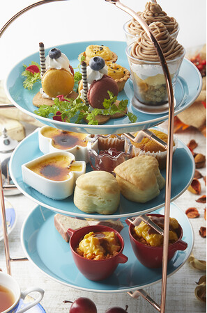 「幻想の国のアリス」特製のティーパーティースタンドには、秋らしいスイーツが満載。軽いお食事もセットになっているので、遅めのランチにもピッタリです。