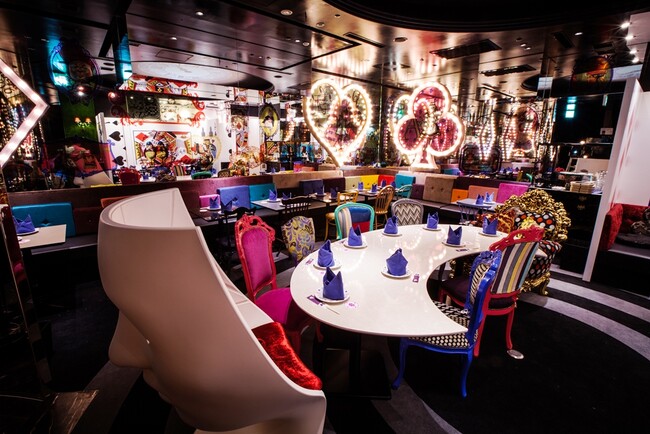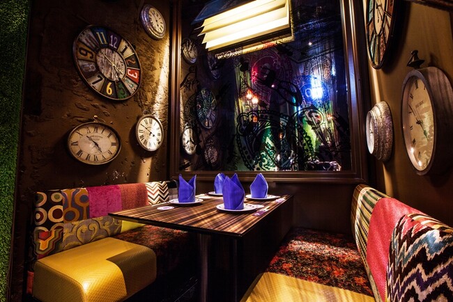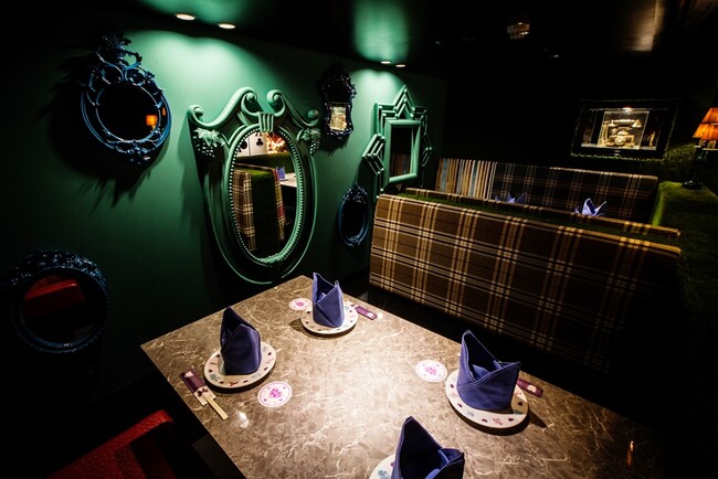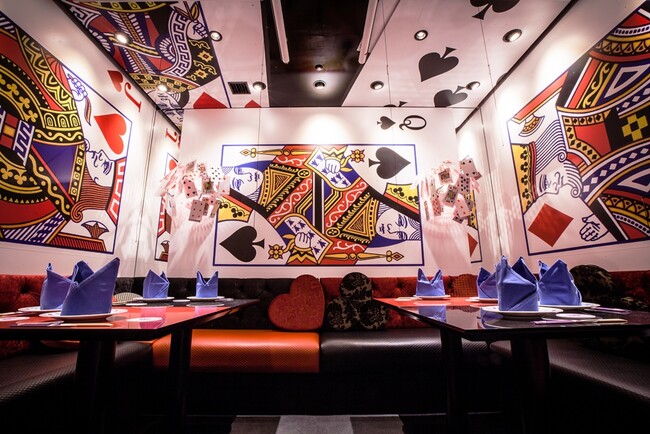 エントランスに立ちはだかるトランプ兵の脇をスルリと抜けて、一歩な足を踏み入れると、天井に大きな懐中時計が浮かぶメインフロアを中心として、トランプに囲まれるソファー席、ハートの女王様ご自慢の庭を模したテーブル席など、英国小説「不思議の国のアリス」をモチーフにしたテーマパークさながらの空間が広がっています。