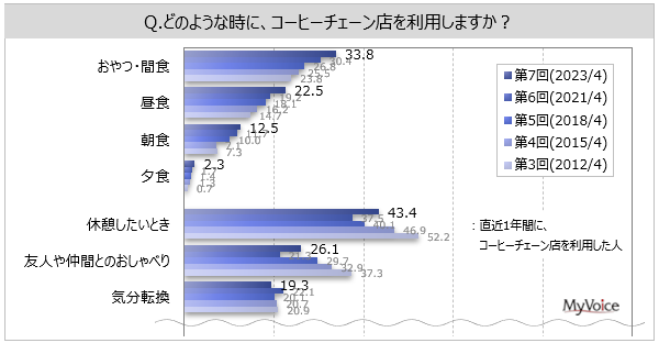 コーヒーチェーン店の利用場面は(複数回答)、「休憩したいとき」が直近1年間利用者の43.4%、「おやつ・間食」が33.8%、「友人や仲間とのおしゃべり」が26.1%、「昼食」が22.5%です。過去調査と比べて、「暇つぶし、時間つぶし」は減少傾向です。