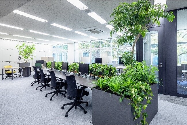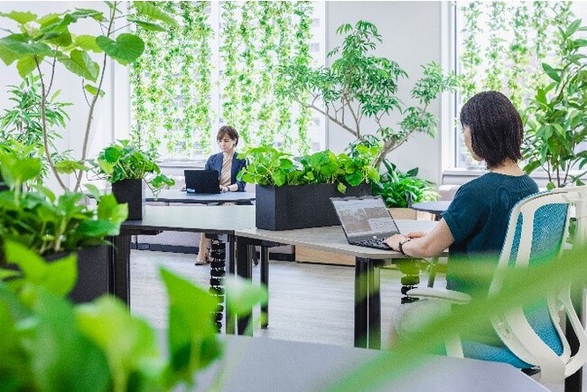 「コモレビズ」では、ストレス軽減につながる最適な「緑視率」が10~15%という実証実験結果と独自の植物データベースに基づき、顧客のニーズに応じた空間をデザインし、導入後の効果測定をストレスの数値化して人の健康と幸福の向上を目指す空間デザインを支援しています。