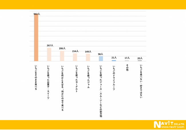 「いちごをどのようにして食べますか?」という質問を複数回答可で行ったところ、「いちごをそのまま食べる」が942人、「いちごを使ったお菓子・スイーツ」が267人、「いちごを何かとまぜる、何かにのせて食べる」が206人という結果になりました。