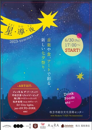 枚方T-SITE(大阪府枚方市)は2023年6月30日(金)、枚方市総合文化芸術センターと共に、音楽や食、アートが楽しめる七夕イベント「星・導・夜 (SEI・DO・YA)2023 summer」を開催します。